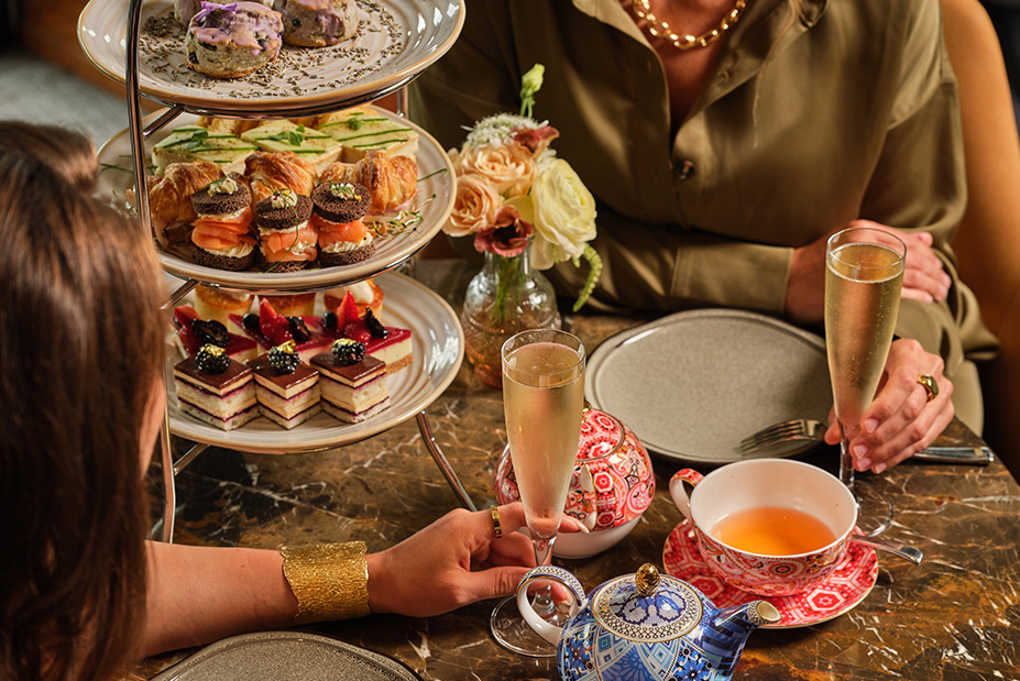 Afternoons bring a stylish pause with the Roses & Rosé A-Tea-X experience, featuring elegant treats, teas, and floral-inspired cocktails in a beautifully decorated lounge.